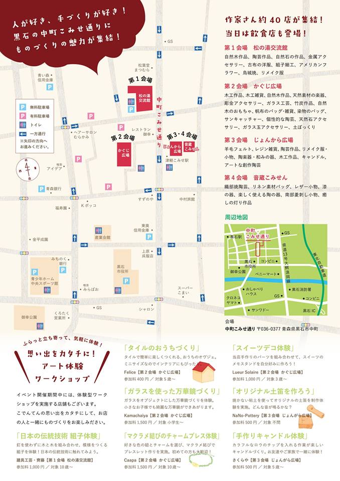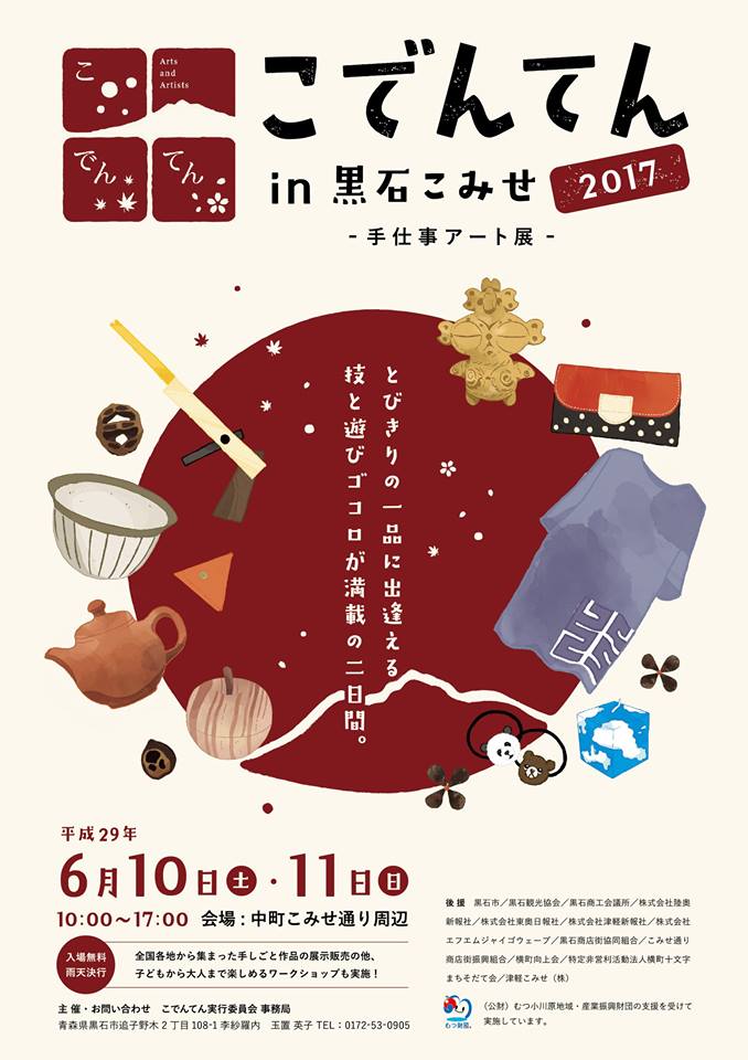 6月10日(土)・11日(日) こでんてん ~手仕事アート展~ 2017.06.07 更新 PDFはこちら 今週末「こでんてん ~ 手仕事アート展 ~ 」が開催されます。 作家さん約40店舗が集結するようです。 4つの会場で開催されます。 第1会場 松の湯交流館 第2会場 かぐじ広場 第3会場 じょんがら広場 第4会場 音蔵こみせん 当日松の湯交流館の駐車場にて飲食店の出店もあります。十文字カフェでも特別メニューを販売する予定です。是非飲食の方も楽しんでいただければと思います。 遊びに来てくださいね。 投稿ナビゲーション 前の記事へ6月24日(土)家庭でできる 簡単!エアコンお手入れ講座次の記事へ6月18日(日) 中国語講座 ~お買い物編~ イベント一覧へ