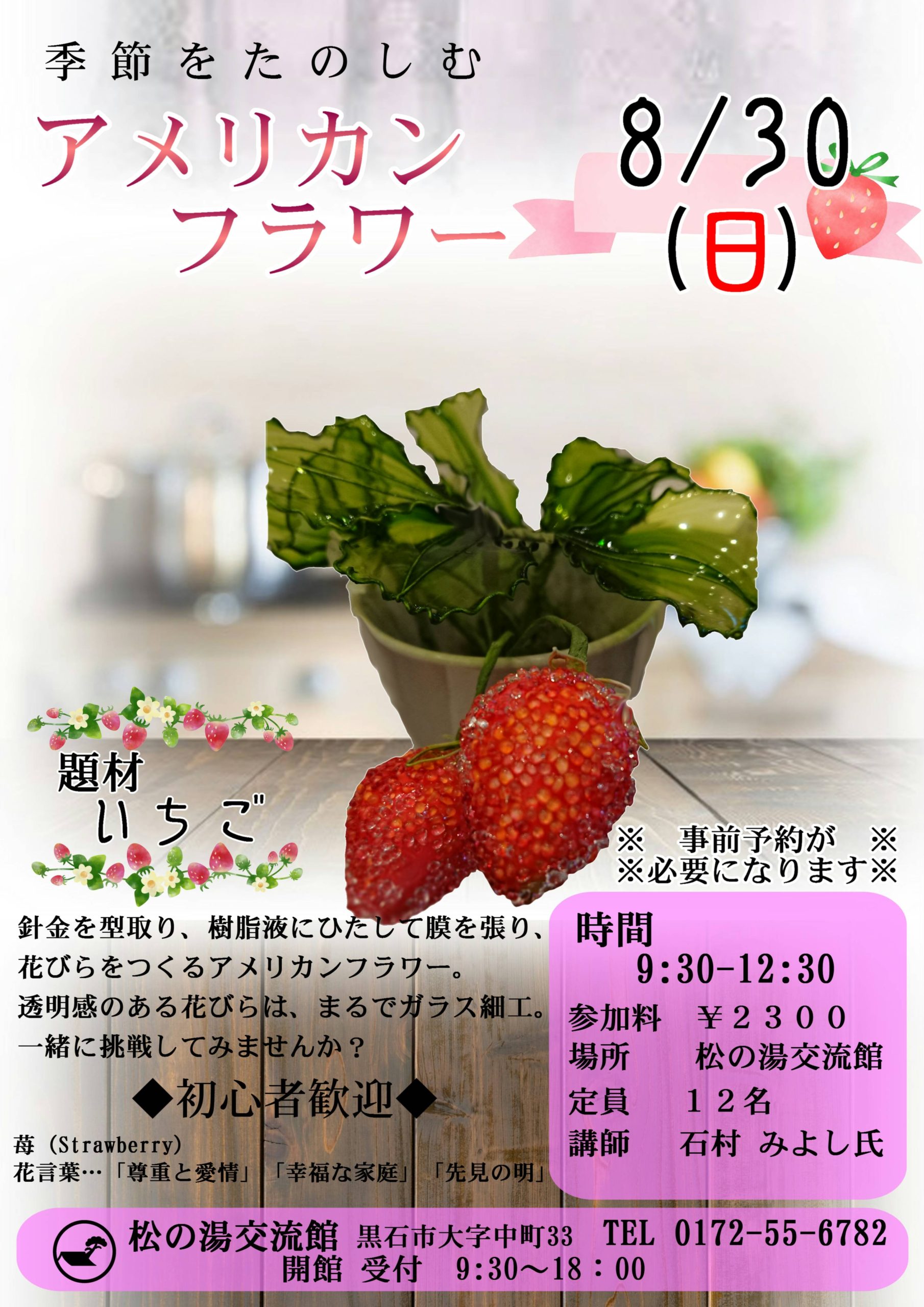 8月 アメリカンフラワー教室 2020.07.26 更新 PDFはこちら アメリカンフラワー教室開催のお知らせ 8/30(日)9:30~12:30まで 当館、市民サロンにて開催 今回の題材は 「いちご」 新しい趣味の一つとして初めてみませんか? 人数制限がございますので、 事前に当館までご連絡くださいませ。 松の湯交流館 0172-55-6782まで 投稿ナビゲーション 前の記事へ林家 とんでん平 青森ツアー2020次の記事へ8月 パステルアート体験 イベント一覧へ
