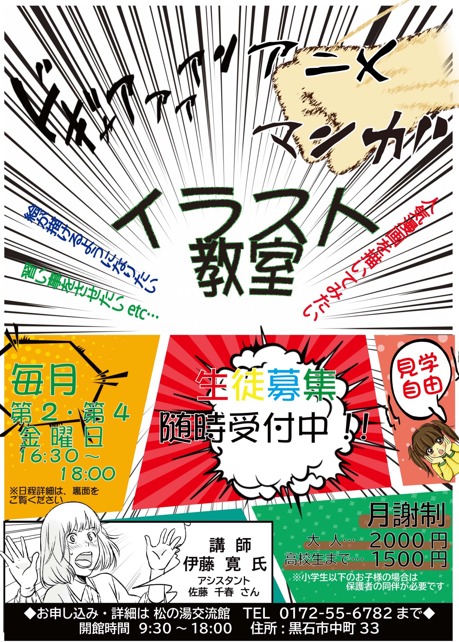 イラスト教室開催のお知らせ 2021.03.19 更新 PDFはこちら リニューアルのお知らせです 今まで「鉛筆美術教室」として 毎月開催されていた教室ですが、 この度、4月から名称が一新 「イラスト教室」👍✏️🎨 として開催いたします あの人気漫画を描いてみたい… 某番組の芸能人みたいに… 絵を描くのを習ってみたい… などなど リニューアルはしますが講師は引き続き 伊藤 寛 さんです 少しでも興味をもった方は TEL 0172-55-6782 松の湯交流館まで 投稿ナビゲーション 前の記事へパステルアート体験のお知らせ次の記事へ4月 アメリカンフラワー教室のお知らせ イベント一覧へ