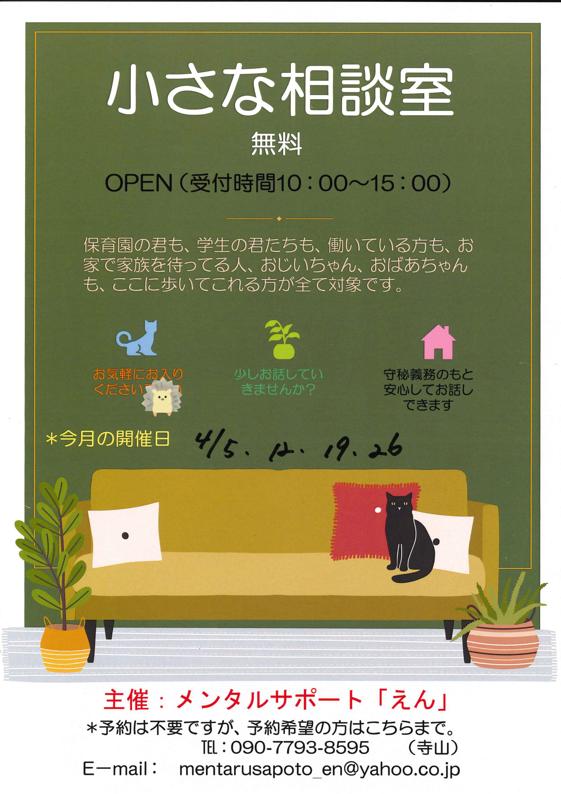 小さな相談室 2021.04.10 更新 PDFはこちら 少しお話して行きませんか? 守秘義務のもと安心してお話しできます。 ここに歩いてこれる方が全て対象です。 【令和3年 4月の開催日】 5日(月)、12日(月)、19日(月)、26日(月) 受付時間:10時~15時 料金:無料 主催:メンタルサポート「えん」 ※予約は不要ですが、予約希望の方はこちらまで。 TEL 090-7793-8595 (寺山) E-mail: mentarusapoto_en@yahoo.co.jp 投稿ナビゲーション 前の記事へAGE測定会青森次の記事へママのための引き締めヨガ イベント一覧へ