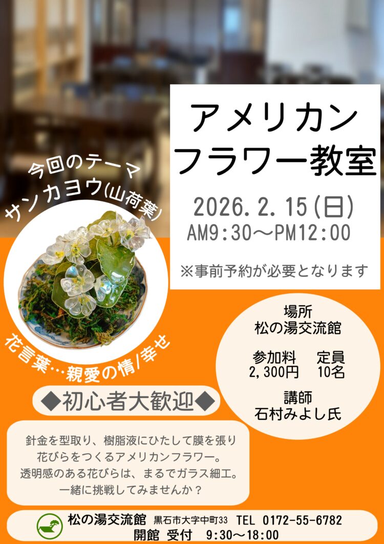透明感のある花びらは、まるでガラス細工˖✧・*˖°。⋆. 素敵なアメリカンフラワー作りを体験してみませんか? 初心者大歓迎! 2月のテ...続きを読む2026.01.20 イベント インフォメーション お知らせ