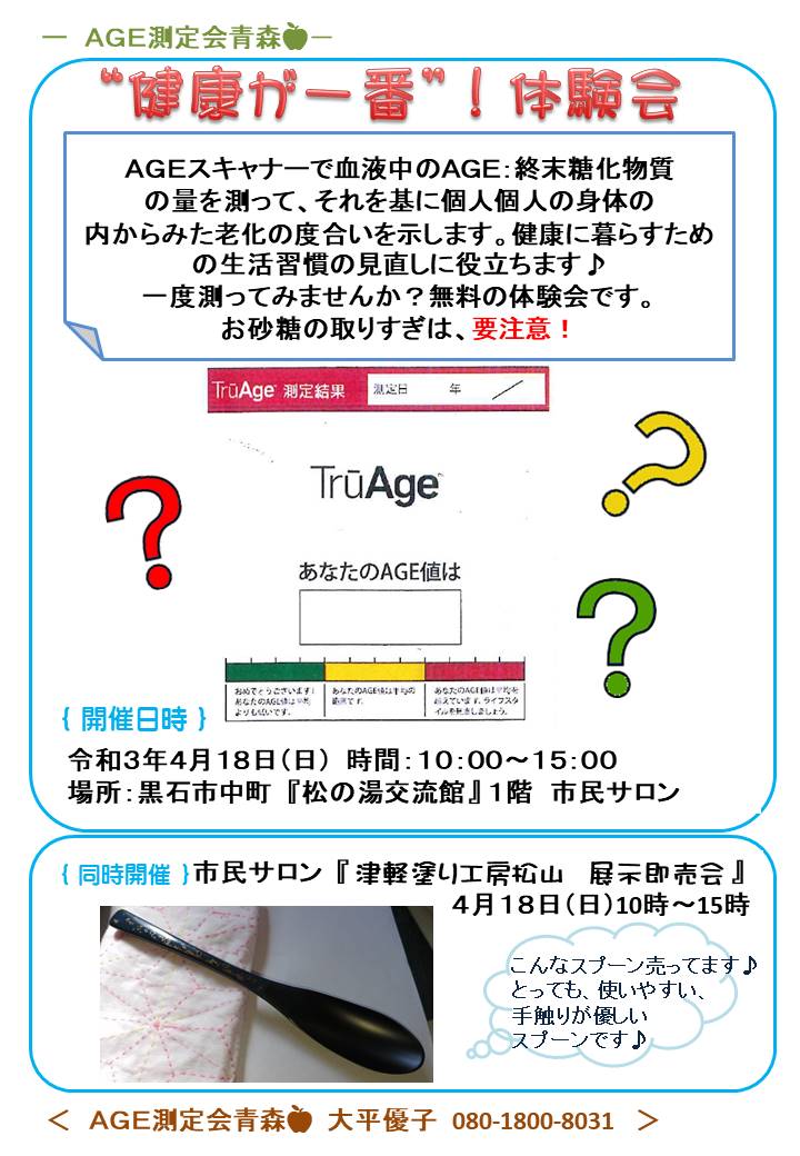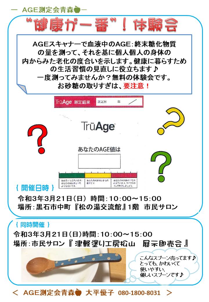 ”健康が一番!”体験会🍎 3/20(日)、AGE測定の開催✨ AGEスキャナーで血液中のAGE:終末糖化物質を測ってみよう 無料体...続きを読む2021.03.15 イベント インフォメーション お知らせ