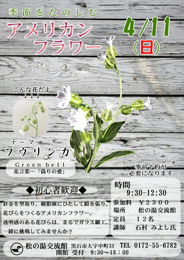 アメリカンフラワー教室 開催のお知らせです 4/11(日) 9:30~12:30まで 当館、市民サロンにて開催 今回のお題は フウ...続きを読む2021.03.28 イベント インフォメーション お知らせ