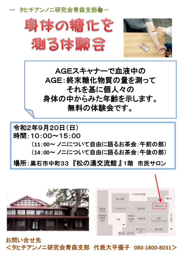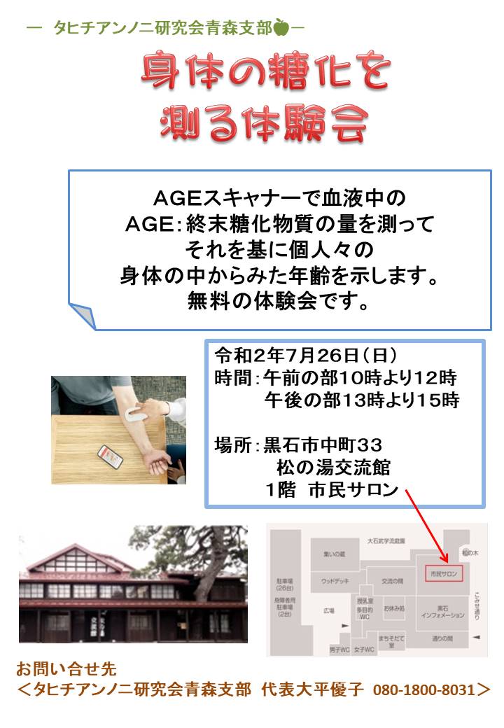 身体の糖化を計る体験会🍎 9/20(日)、AGE測定の開催✨ AGE?体内の糖化を見てみよう 無料体験会ですの、是非、ご来館下さい...続きを読む2020.09.18 お知らせ