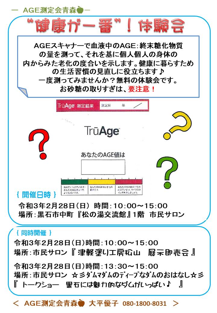 ”健康が一番!”体験会🍎 2/28(日)、AGE測定の開催✨ AGEスキャナーで血液中のAGE:終末糖化物質を測ってみよう 無料体...続きを読む2021.02.21 イベント インフォメーション お知らせ